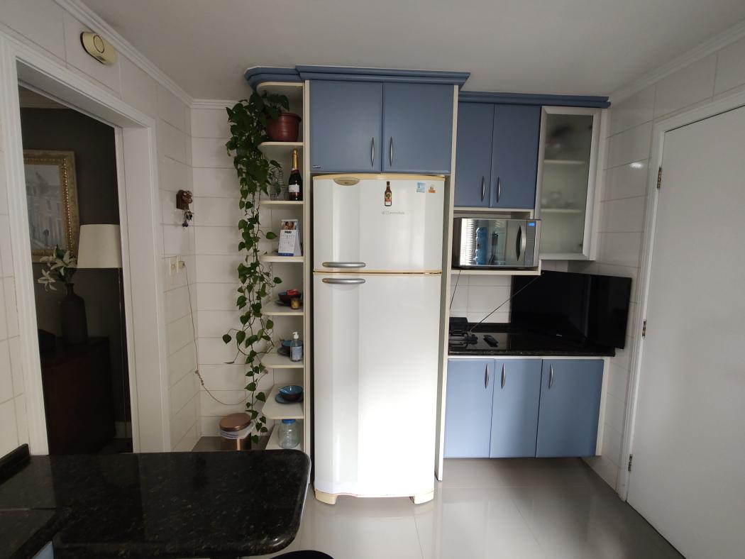 Na cozinha armários planejados, geladeira, microondas, fogão e depurador.