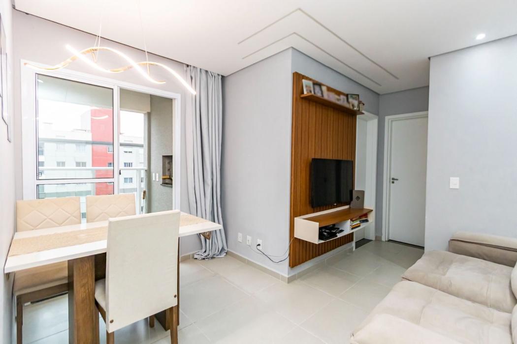 -Sala para 2 ambientes com rack, mesa e 3 cadeiras