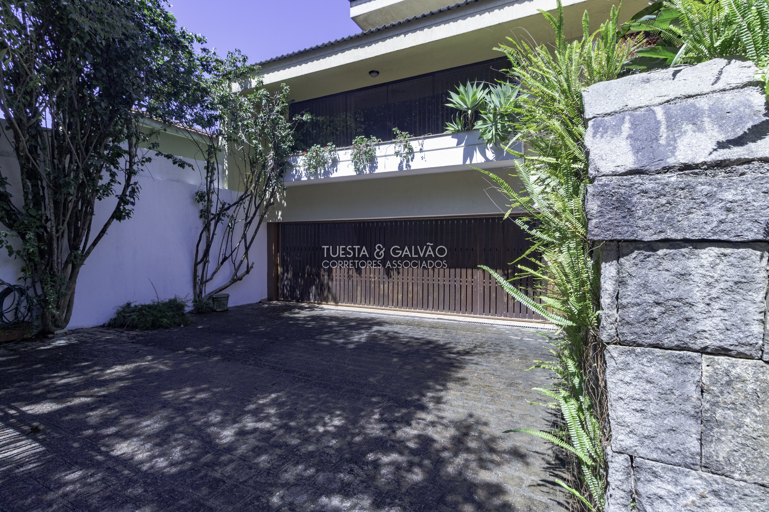 Nivel da rua: 6 vagas de garagem (3 cobertas), apartamento anexo com quarto, cozinha e 1 banheiro, 1 despensa enorme e três escadas de acesso ao primeiro pavimento.
