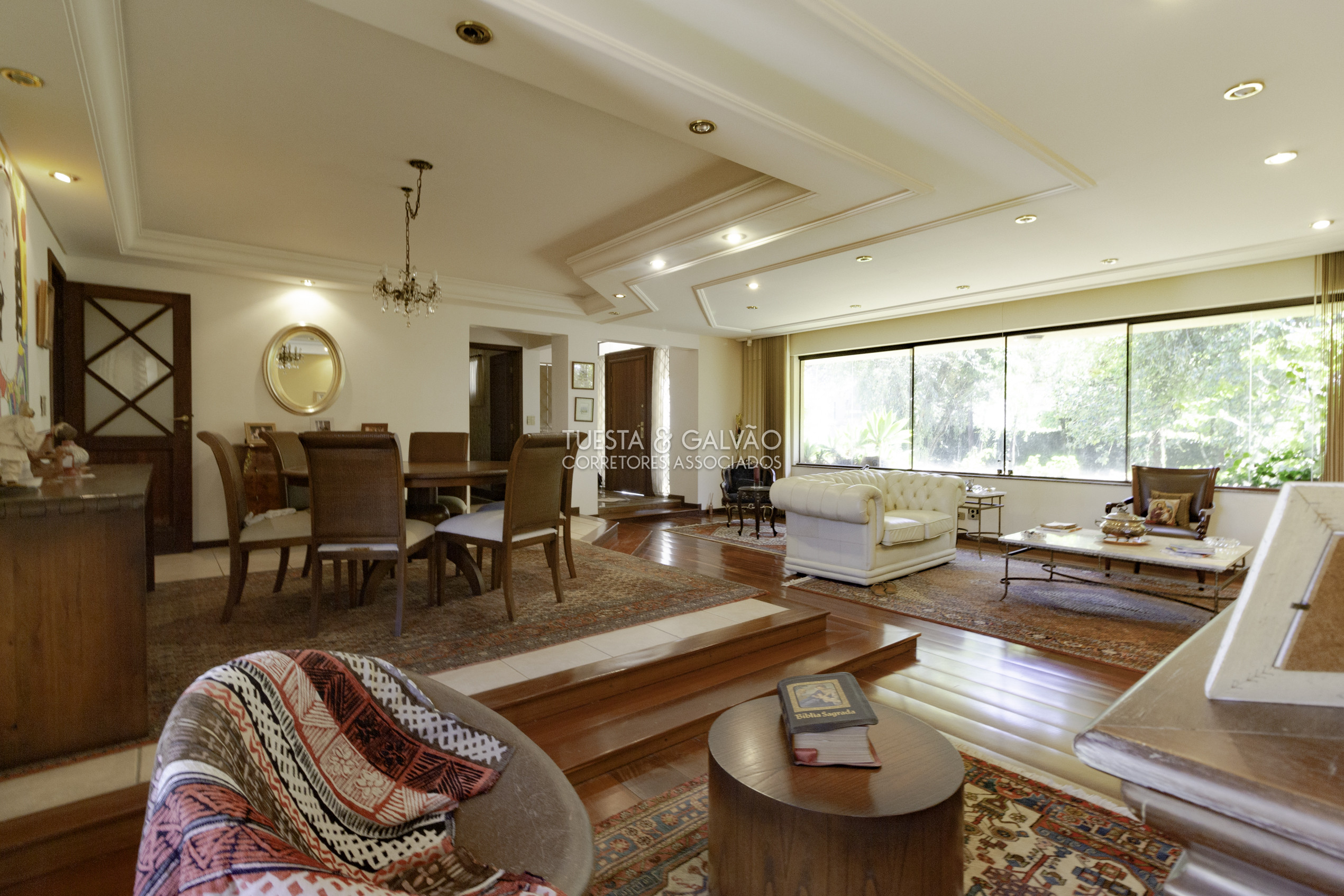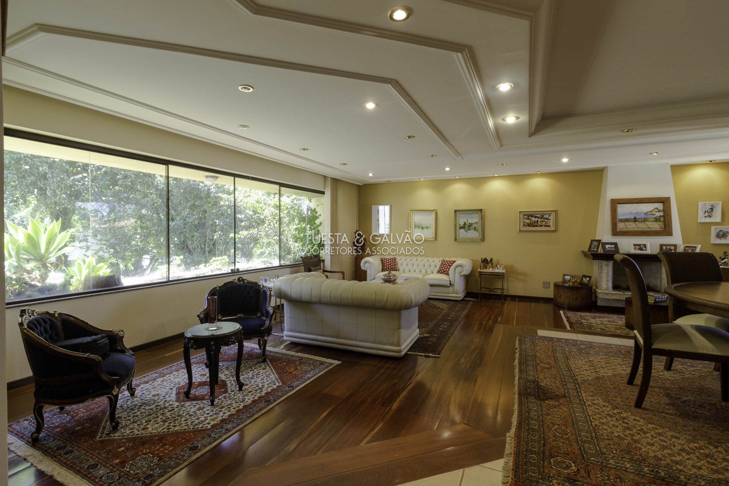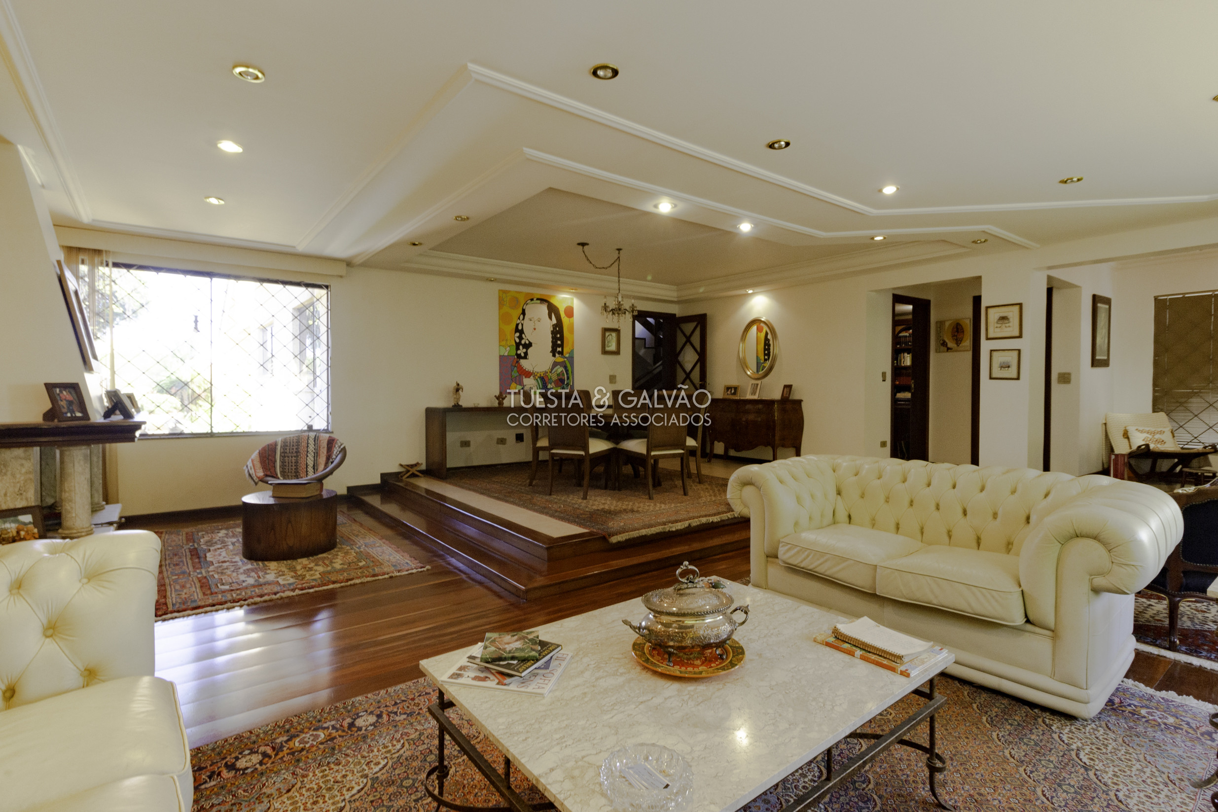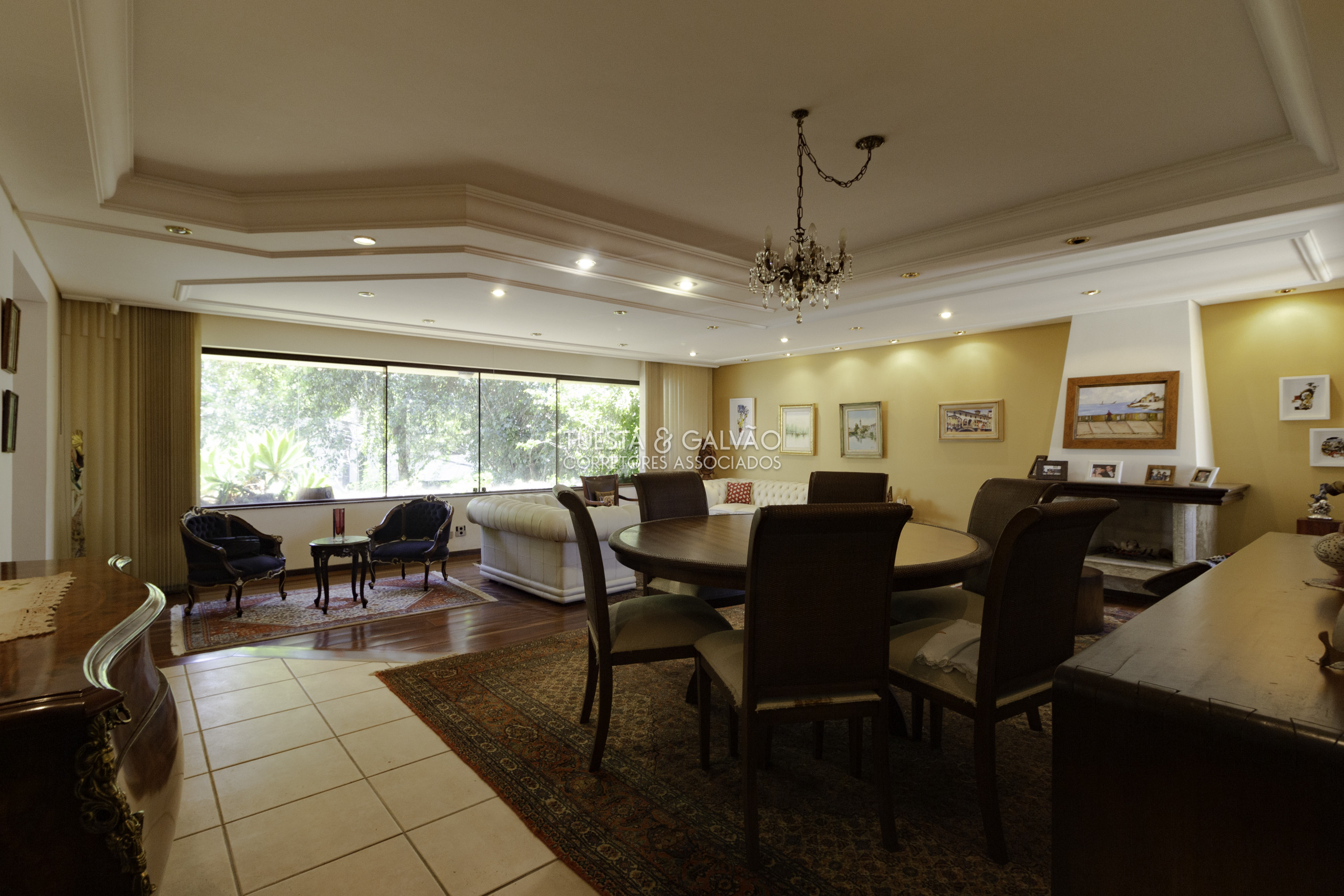 1º. pavimento: ampla sala para até 4 ambientes (com lareira), escritório, sala íntima, 2 lavabos, enorme área gourmet com cozinha copa e churrasqueira, despensa, lavanderia e excelente quintal, parte gramada e parte com piso.