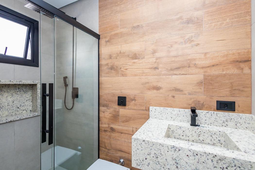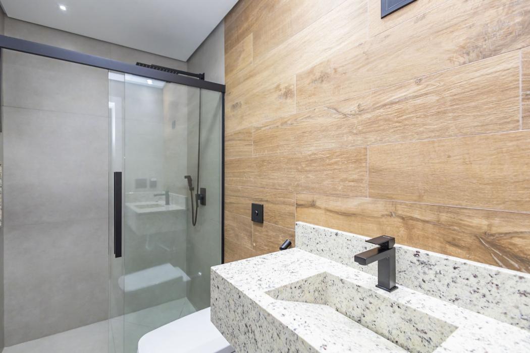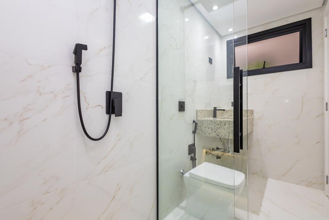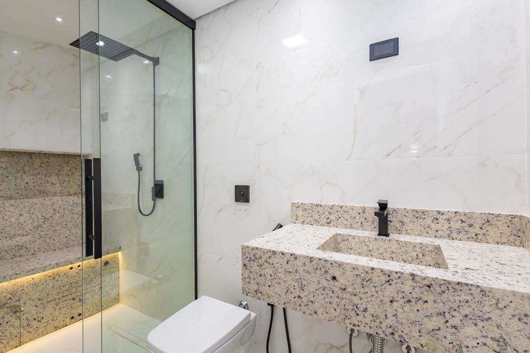 - Banheiro suíte com pia esculpida em mármore, piso aquecido, ducha higiênica, banco de sauna com led, box e metais instalados