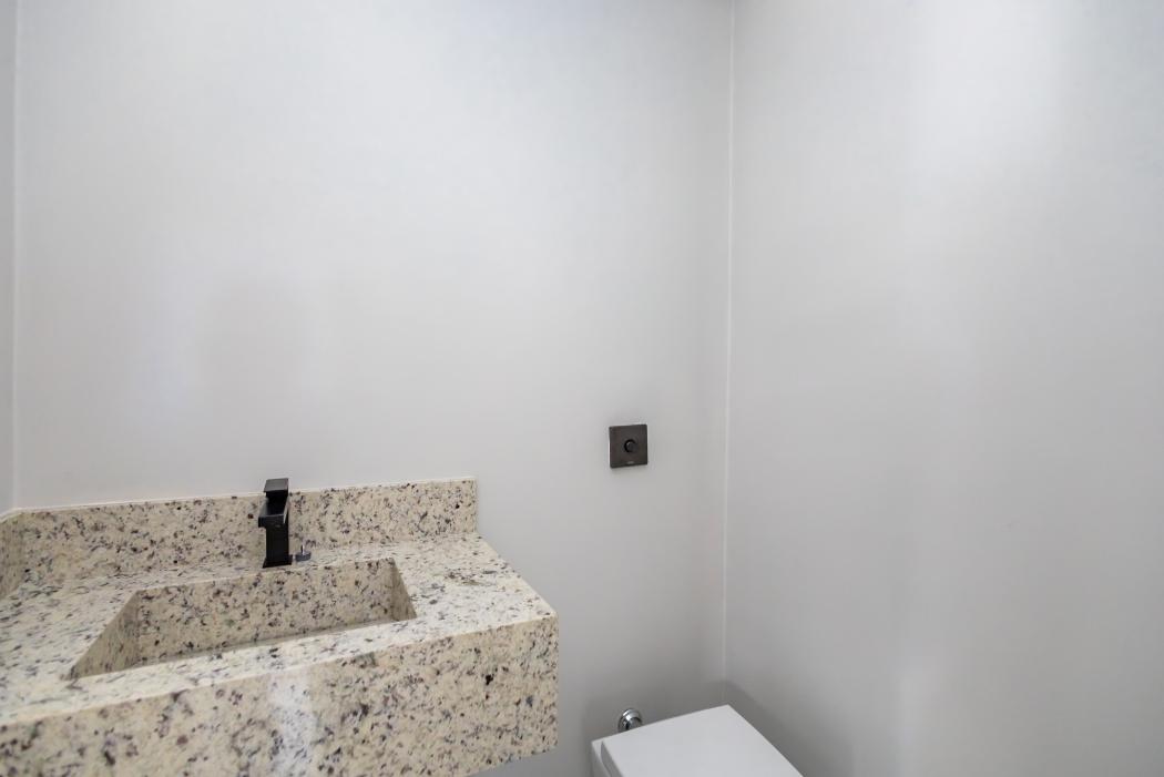 - Banheiro social com pia esculpida em mármore, louça moderna, piso aquecido, ducha higiênica, box e metais instalados